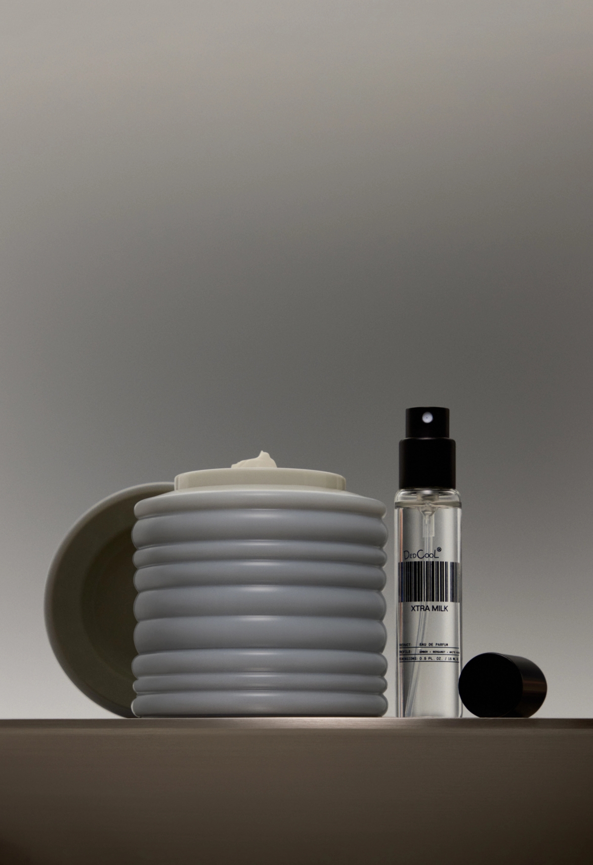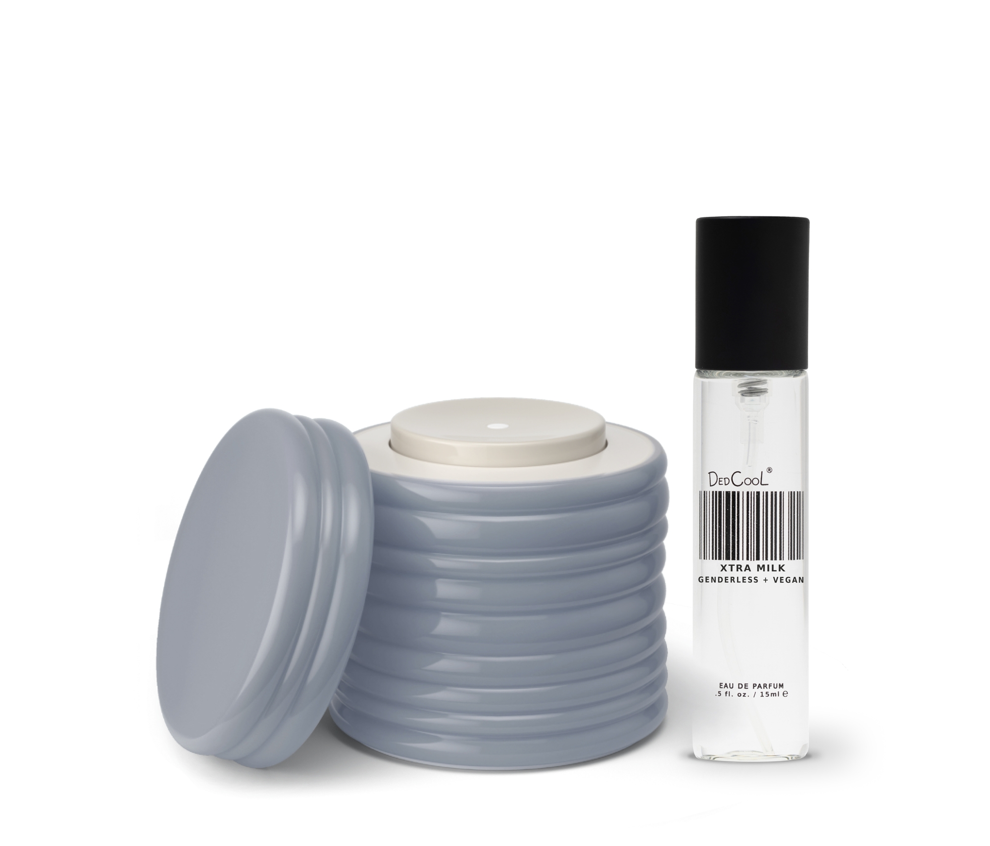 Includes: refillable case in a special-edition soft baby blue, Xtra Milk refill pod (50ml, ~6 weeks of use), Xtra Milk travel perfume spray (15ml).